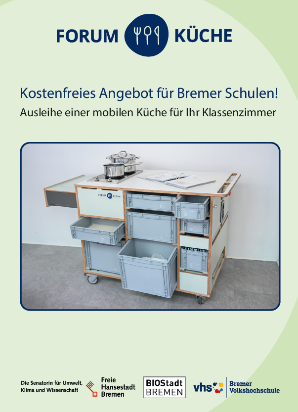 Das Bild zeigt ein Werbeplakat für das Forum Küche, das Bremer Schulen die kostenlose Ausleihe einer mobilen Küche anbietet. Abgebildet ist die ausgestattete mobile Küche, dazu Logos beteiligter Organisationen vor hellgrünem Hintergrund.