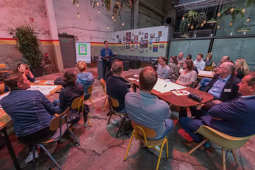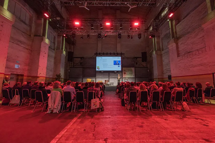 Bild von der Bühne der Fachtagung mit Publikum und Moderator