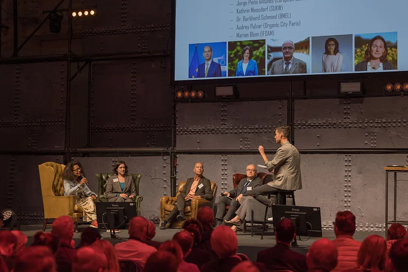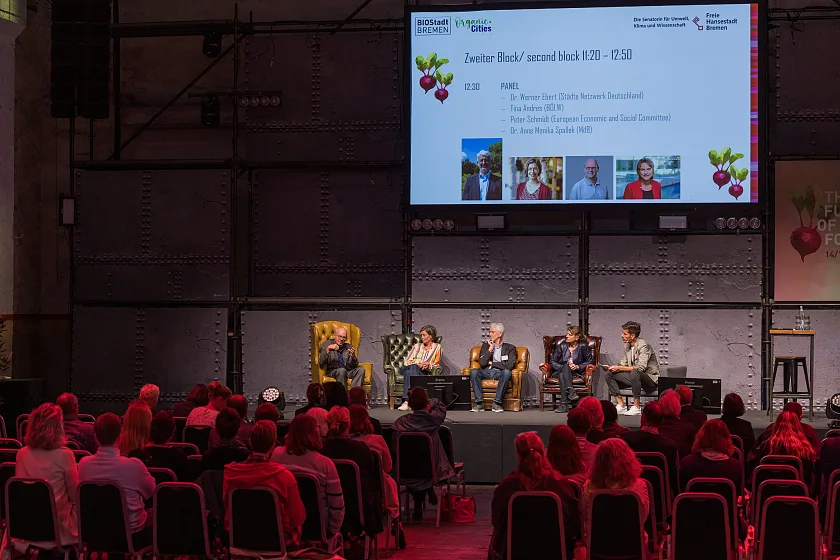 Bild einer Bühnensituation mit 4 Personen. Die Personen sind von links nach rechts: Peter Schmidt (Vorsitzender der Fachgruppe Landwirtschaft, ländliche Entwicklung und Umwelt im Europäischen Wirtschafts- und Sozialausschuss), Tina Andres (Vorstandsvorsitzende Der Bund Ökologische Lebensmittelwirtschaft), Dr. Werner Ebert (Geschäftsführer Bio Städte Netzwerk Deutschland), Dr. Anne Monika Spallek (Mitglied des Bundestages , Ausschuss für Ernährung und Landwirtschaft), Dan Anthes (Moderator der Veranstaltung). Es handelt sich um eine Diskussionsrunde.